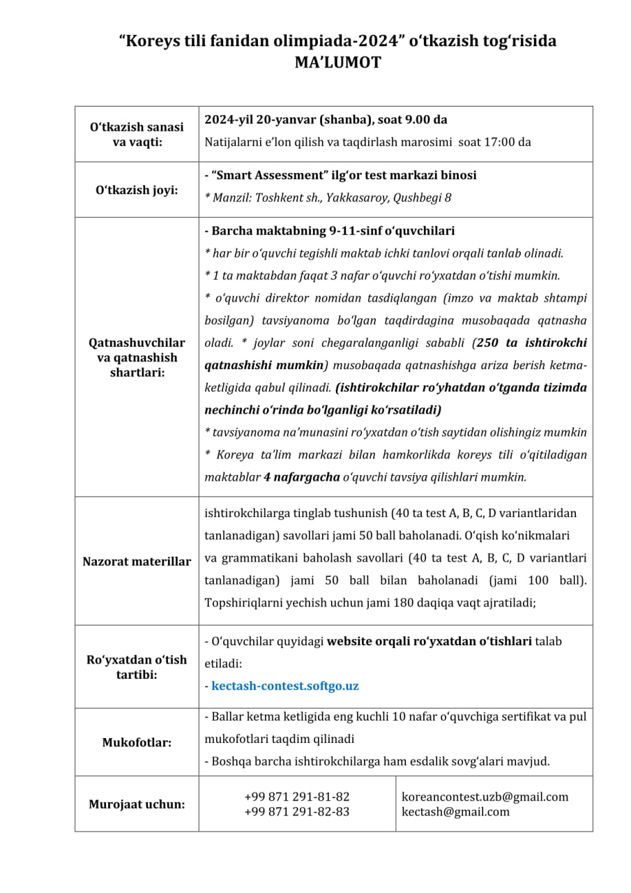 Koreya Ta’lim markazi bilan hamkorlikda 2024-yilning 20-yanvar kuni Toshkent shahrida ilk bora "Koreys tili fanidan olimpiada - 2024" olimpiadasi tashkil etilmoqda.